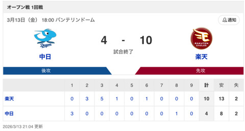 【試合結果】中日 4-10 楽天 細川3ラン 近藤・根尾・藤嶋無失点