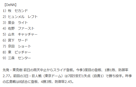 【横浜大勝利】DeNA、打順大幅組み換えがズバリ!ドラ3宮下プロ初安打&東2勝目で広島を撃破wwwww