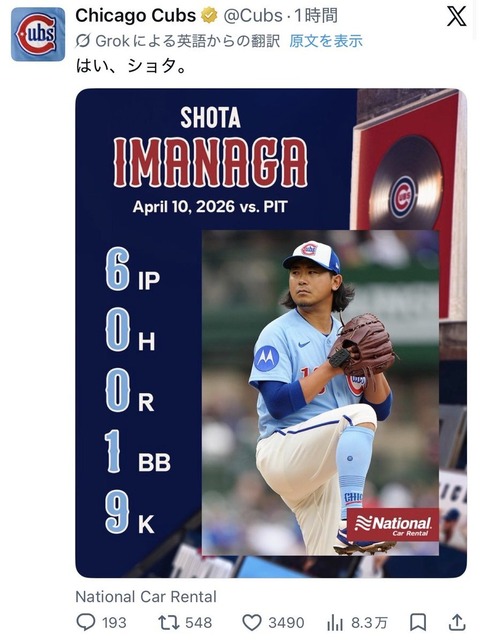 【悲報】今永昇太、6回無安打9奪三振100球降板の衝撃…「ノーヒッターあったやろ」カブスファン困惑